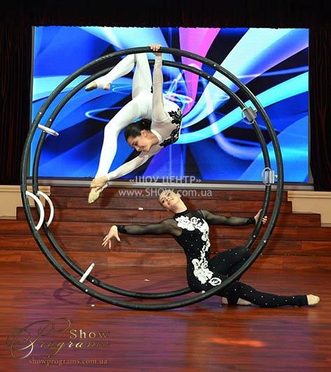 Шоу в Ренском колесе уникальное и единственное в Украине. В номере гармонично сочетаются спортивная и художественная гимнастика. Красота и грация мощного колеса противостоит хрупким артистам, которые исполняют невероятные красивые и сложные трюки и укрощают огромное величественное колесо.